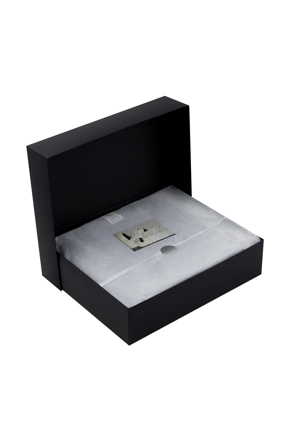 Каждый плед «Беринг» — это церемония распаковки. Он представлен в матовой черной коробке с логотипом Люксбери, укутанный в нежную бумагу -тишью. Внутри вас ждет арт-открытка с работой московской художницы Марии Стадник «Landscape 43», где совершенство северной архитектуры застыло на фоне величественного нордического пейзажа.
